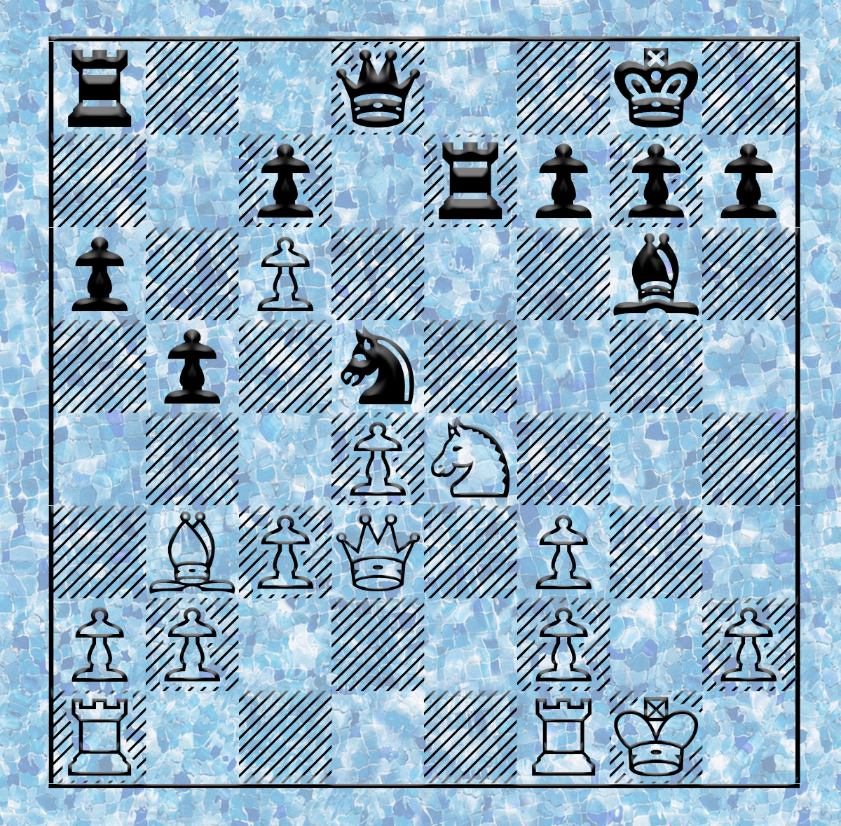 1.e4 e5 2.Nf3 Nc6 3.Bb5 a6 4.Ba4 Nf6 5.O-O Be7 6.Qe2 (Known as the Worrall Attack.) 6…b5 7.Bb3 O-O 8.c3 d5 9.exd5 Bg4 10.dxc6 e4 11.d4 exf3 12.gxf3 Bh5 13.Bg5 Re8 14.Nd2 Nd5 15.Bxe7 Rxe7 16.Qd3 Bg6 17.Ne4